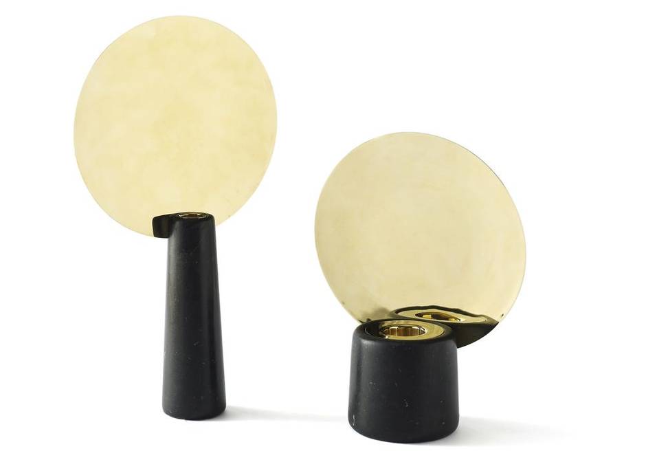 The Peacock candle holders, by French designer Dan Yeffet, have a simple, heavenly beauty. Elegant, black marble stands support a bright polished disc. As the flame burns, the flicker reflects against the brass, creating a star-like, twinkling reflection. From $880. Through avenue-road.com.
