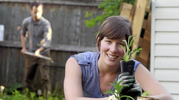 Julia Monkman plants sage as her boyfriend Alec prepares for a new flower bed behind her at home in Montreal, May 21, 2010.Christinne Muschi
