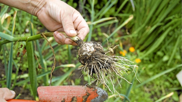 Curing ensures the protective skin around the bulbs doesn't get mouldy. Using a dry brush, clean off the dirt. If you've grown soft-neck garlic, you can braid the stems and hang it up to store. For hard-neck garlic, trim the stems down to about 10 cm. Cured properly and stored in a dry, well-ventilated place, garlic can keep for around six months.