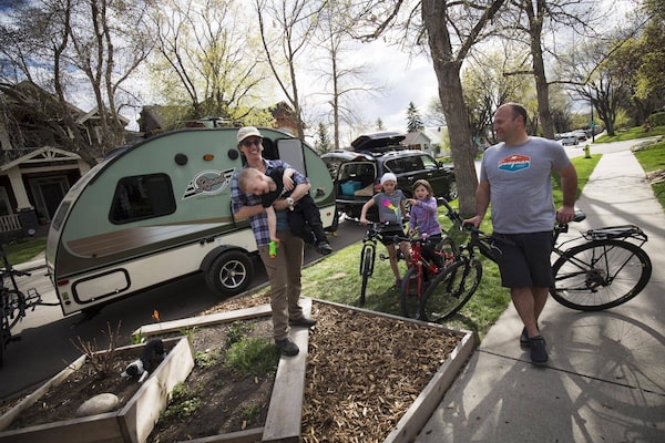 Jeff and Shelley Cyre, with their kids Wyatt, Riley and Evan, pack for their upcoming cross-Canada trip in Calgary on May 10, 2017.Todd Korol