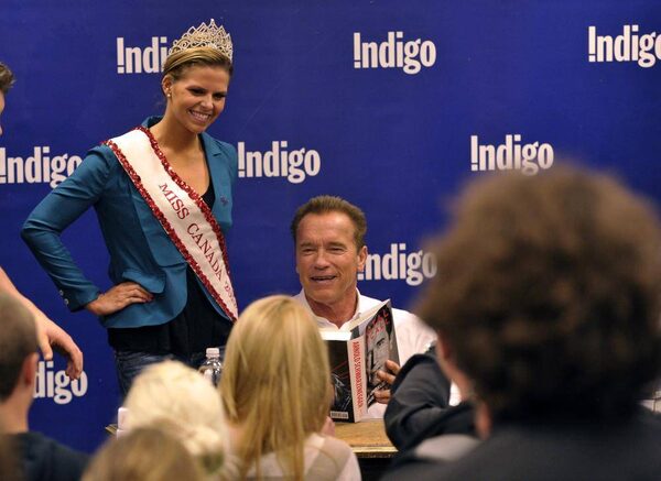 Arnold Schwarzenegger signing copies of his new autobiography "Total Recall" for Miss Canada 2012 Jaclyn Miles at Indigo in Toronto October 4, 2012.Mike Cassese