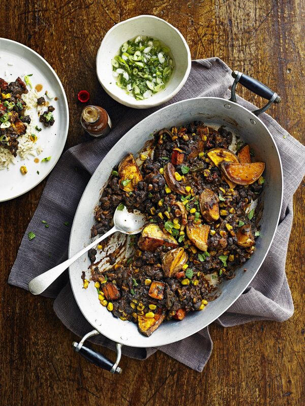 So, in a nod to diversity and the passion and heart that I consistently discover in migrant communities and in their cooking, I've taken a comforting veggie ragù and put my own Mexican twist on it. Loaded with spices and packed with sweet winter veggies and black beans, this no-fuss tray bake is an absolute winner at home. I've made a super-fresh, zippy salsa to liven it up – season it with that Mexican spirit by being brave with the lime juice and chipotle, and you'll have it nailed.