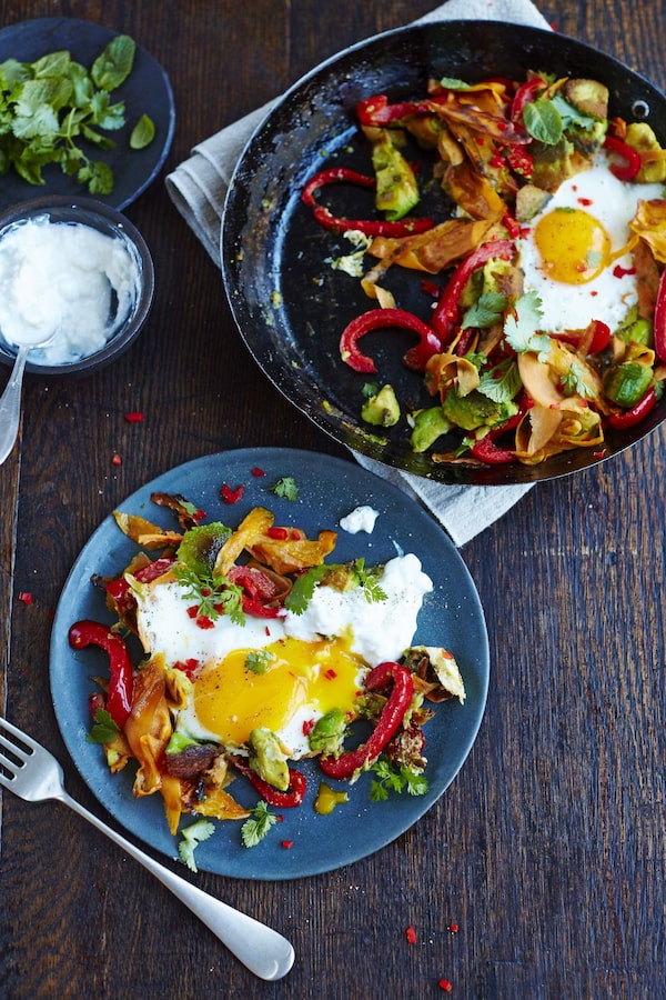 Eggs are one of the best-value forms of protein you can get. They contain a super-cocktail of amazing micronutrients and stuff that, frankly, is very good for you. From nutritious breakfasts and quick lunches to using them in all manner of beautiful desserts, eggs are great in so many ways. With that in mind, I've given you a nutritious, quick breakfast in the form of beautiful charred avo and eggs. Eggs are high in iodine, which is used by the thyroid gland to help it regulate the body's metabolism – a perfect kick-start to the day. With ribbons of sweet potato, charred peppers and fresh chili, this is super colourful, nutritious and well worth the 15 minutes it takes to make.