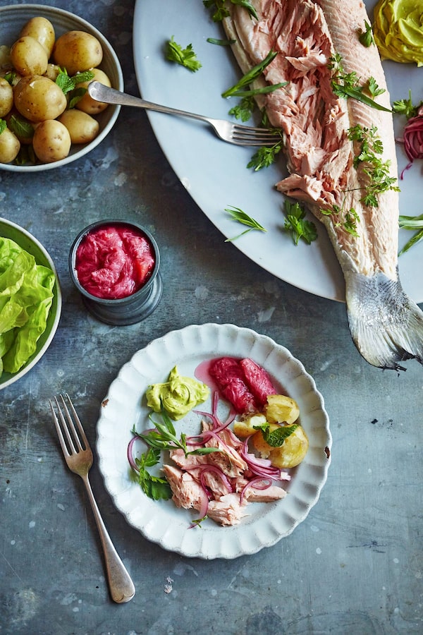 Serve the poached salmon with the pickled onions, rhubarb sauce and tarragon mayo on the side. Always good with some lovely boiled new potatoes, and a fresh green salad.