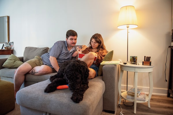 Kai Farnum of Aurora, Ont. – playing with Benny the dog at breakfast – works three jobs, their husband two. Earning enough to start a family is a long shot, they say.