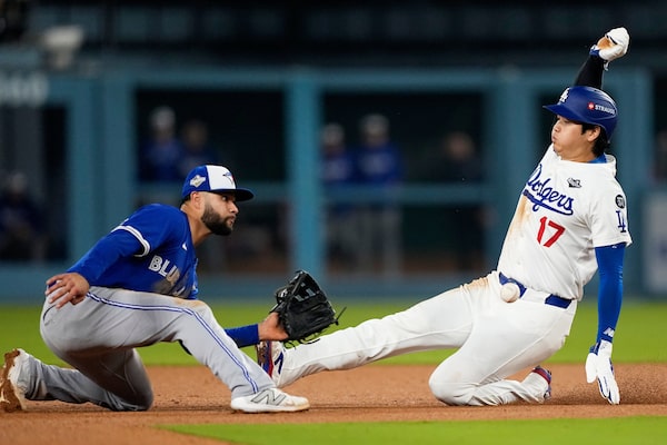 Los Angeles Dodgers' Shohei Ohtani is tagged out by Toronto Blue Jays shortstop Isiah Kiner-Falefa after an attempted steal during the ninth inning in Game 3 of the World Series, Monday, in Los Angeles.Brynn Anderson/The Associated Press