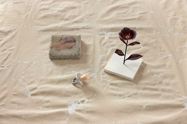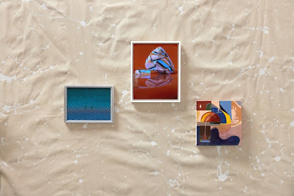 From left: Dexter Barker-Glenn, Sleep Debt, 2023. (Shown laying flat but meant to be hung). Hydrographic Print, Humidifier Wick Filter. 7 inches by 7 inches by 1.5 inches. $1,000 at Hunt Gallery (huntgallery.info). Fin Simonetti, Pacifier 8, 2022. Bianco Neve marble, Portuguese pink marble, lock shackle. 2.25 inches by 3 inches by 3.75 inches. US$3,500 at Cooper Cole (coopercolegallery.com). Winnie Truong, Wait to Tell, 2024. Coloured pencil, cut paper, mixed media. 9 by 5 by 3.5 inches. $2,200 at Patel Brown (patelbrown.com).Brandon Titaro/The Globe and Mail