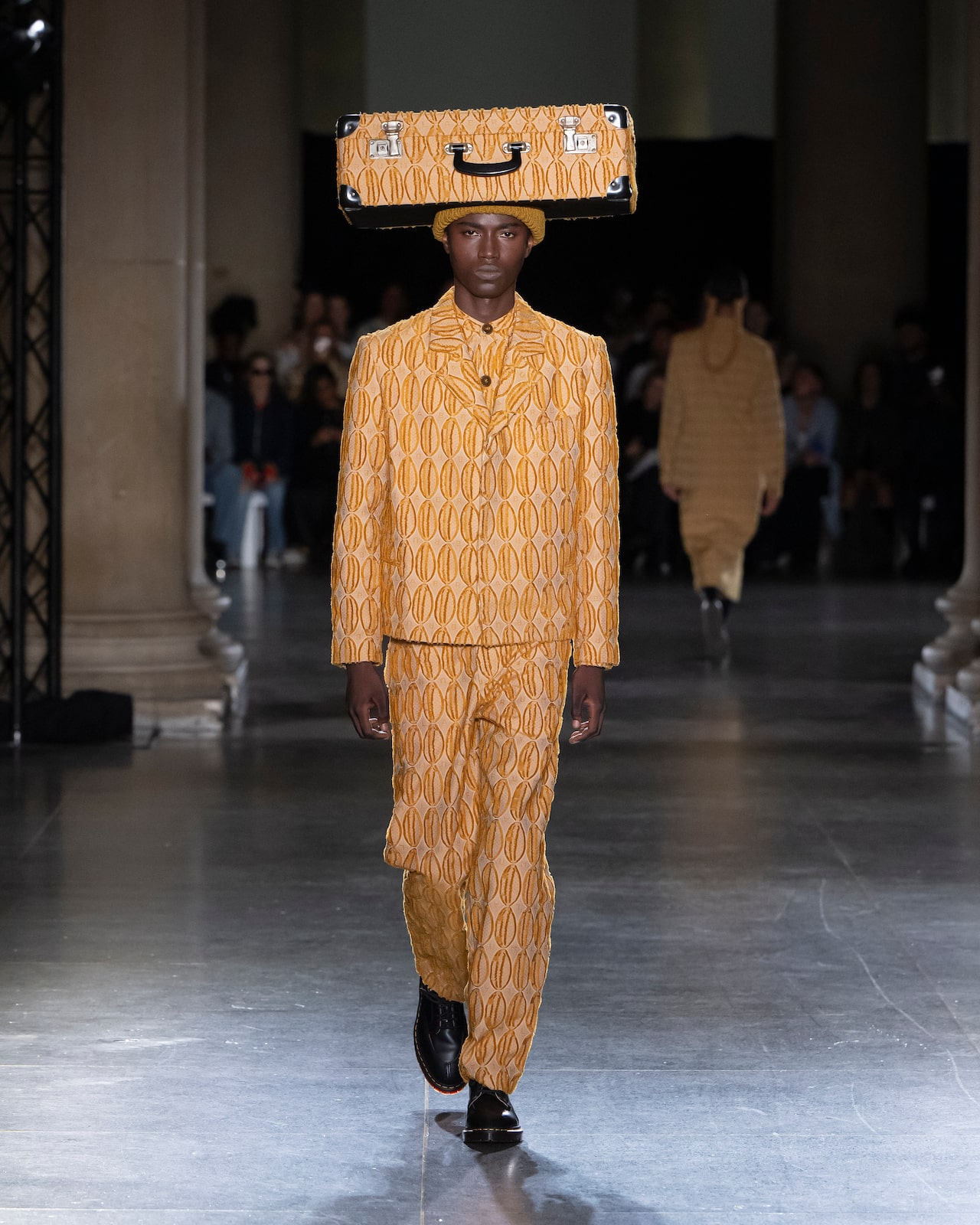 With its own 10th birthday to fete this year, tailoring-centric Labrum London’s founder and creative director Foday Dumbuya thrilled the audience gathered in the Tate Britain gallery. Consistently inspired by tales of cross-cultural movement and the African diaspora, Dumbuya – born in Sierra Leone and partially raised in Cyprus – infused an array of sublime suiting with a sense of storytelling by topping models’ heads with suitcase headwear fashioned by milliner Lucy Barlow. The men’s-wear label, which won the Queen Elizabeth II Award for British Design in 2023, is known for its zesty textiles, and the fall 2024 collection – aptly titled “Journey of Colours” – carried on this narrative through its far-reaching use of hues and a print based on passport pages.