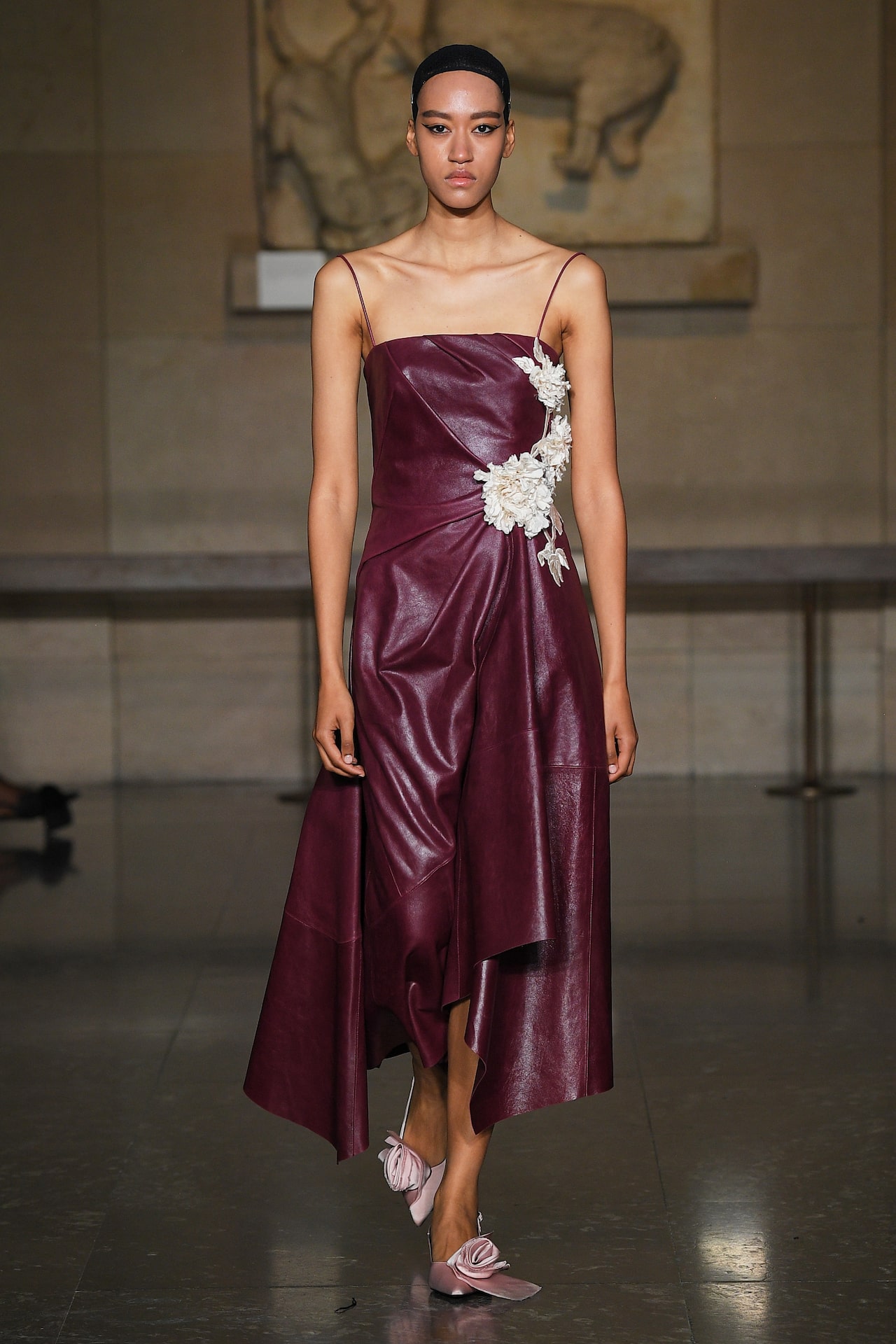 Suitably set in a British Museum room that displays an array of Parthenon statues, Montreal-born Erdem Moralıoğlu’s show paid homage to the Greek opera singer Maria Callas during his runway presentation. Calling on her penchant for high-glamour details and mid-century silhouettes such as swing coats and amply skirted cocktail frocks, Moralıoğlu’s romantic mix of looks was spellbinding in its lush materiality and winking gestures – like the silk rose-adorned footwear that evoked the image of flowers being thrown at the feet of someone taking a bow on stage. The range of textiles was also noteworthy, with flamboyant marabou feathers affixed to knit separates, and a merlot-coloured leather sumptuously draped into a floral-embellished evening dress.