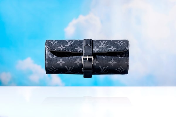 Crafted in Louis Vuitton’s moody Eclipse Monogram canvas, the brand’s watch roll comes with a removable microfibre cushion and microfibre lining to ensure optimal transportation of tony timekeepers. Three watch case.
