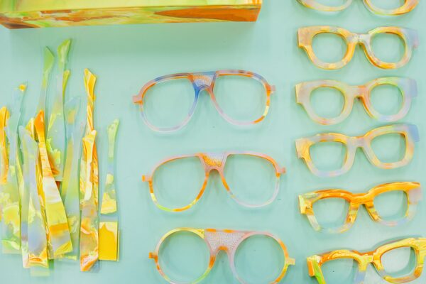 While building their business, the duo came face to face with how wasteful eyewear creation can be – over 80 per cent of each acetate sheet is discarded after frames are cut in typical production. “We were producing so much waste, and it was so frustrating to us, especially living here and being so conscious of how beautiful our surroundings are,” Sydney says. So, the couple began “hoarding scraps,” compiling individual colour libraries and weights (each part of the frame is a different weight – the thickest being around the eyes and the thinnest being on the arm around the temples) that could later be combined with heat and pressure to make sheets of new acetate for future pieces.