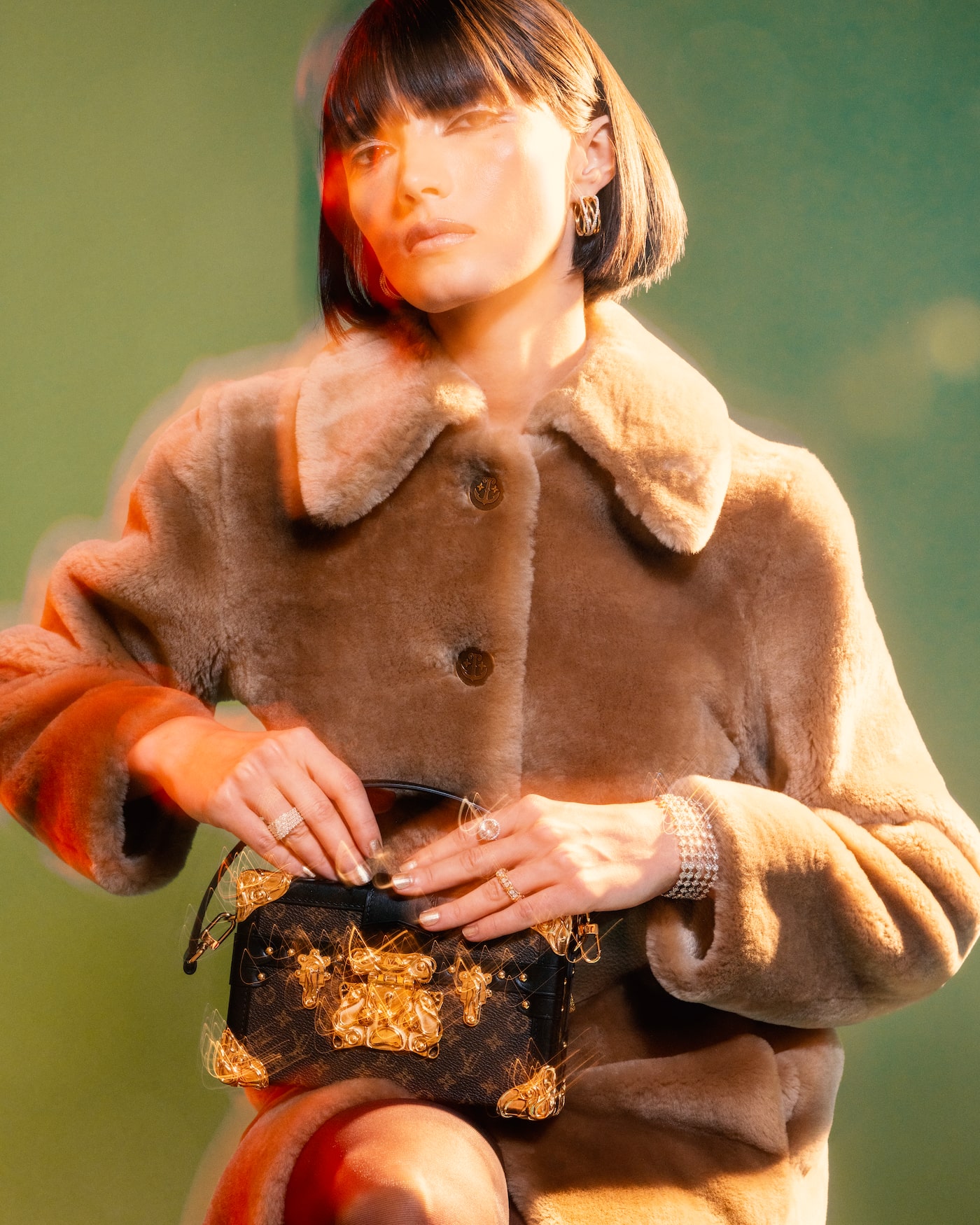 Coat, $14,500, bag, $11,900 at Louis Vuitton (louisvuitton.com). Rosée du Matin 18-karat white and yellow gold earrings set with 0.99 carats of round, brilliant cut diamonds, $10,500, Salon 18-karat white gold, 4.32-carat aquamarine and diamond ring (on left index finger), $2,550 at Birks (maisonbirks.com). Palmyre bracelet in rhodium plated 18-karat white gold with 18.82 carats of diamonds, $277,000, Perlée ring in rhodium plated 18-karat white gold with 0.76 carats of diamond (on right hand), $16,300 at Van Cleef & Arpels (vancleefarpels.com). Jean Schlumberger by Tiffany Sixteen Stone Ring in 18-karat gold and platinum with 1.14 carats of round, brilliant diamonds (on left ring finger), $19,400 at Tiffany & Co. (tiffany.ca).