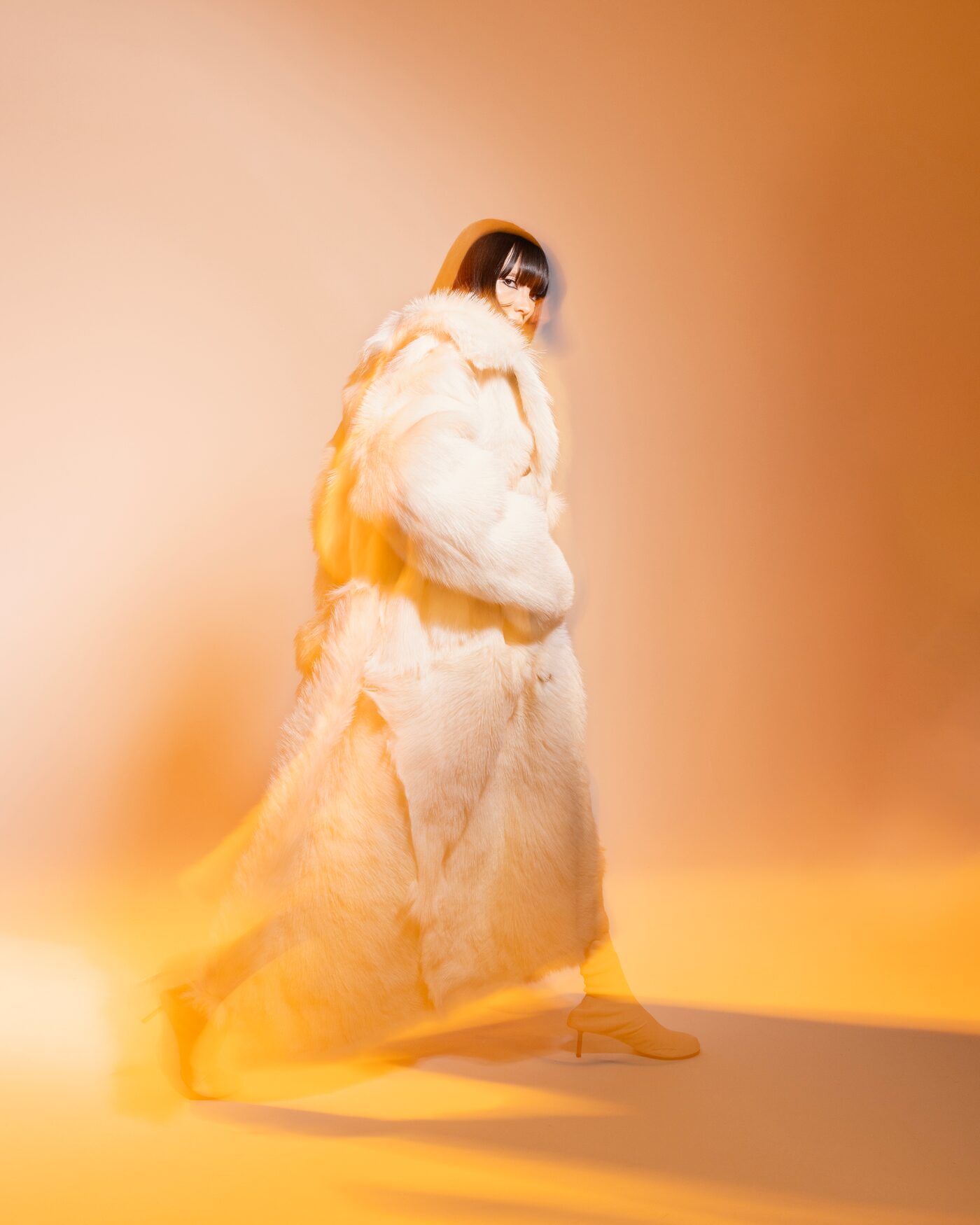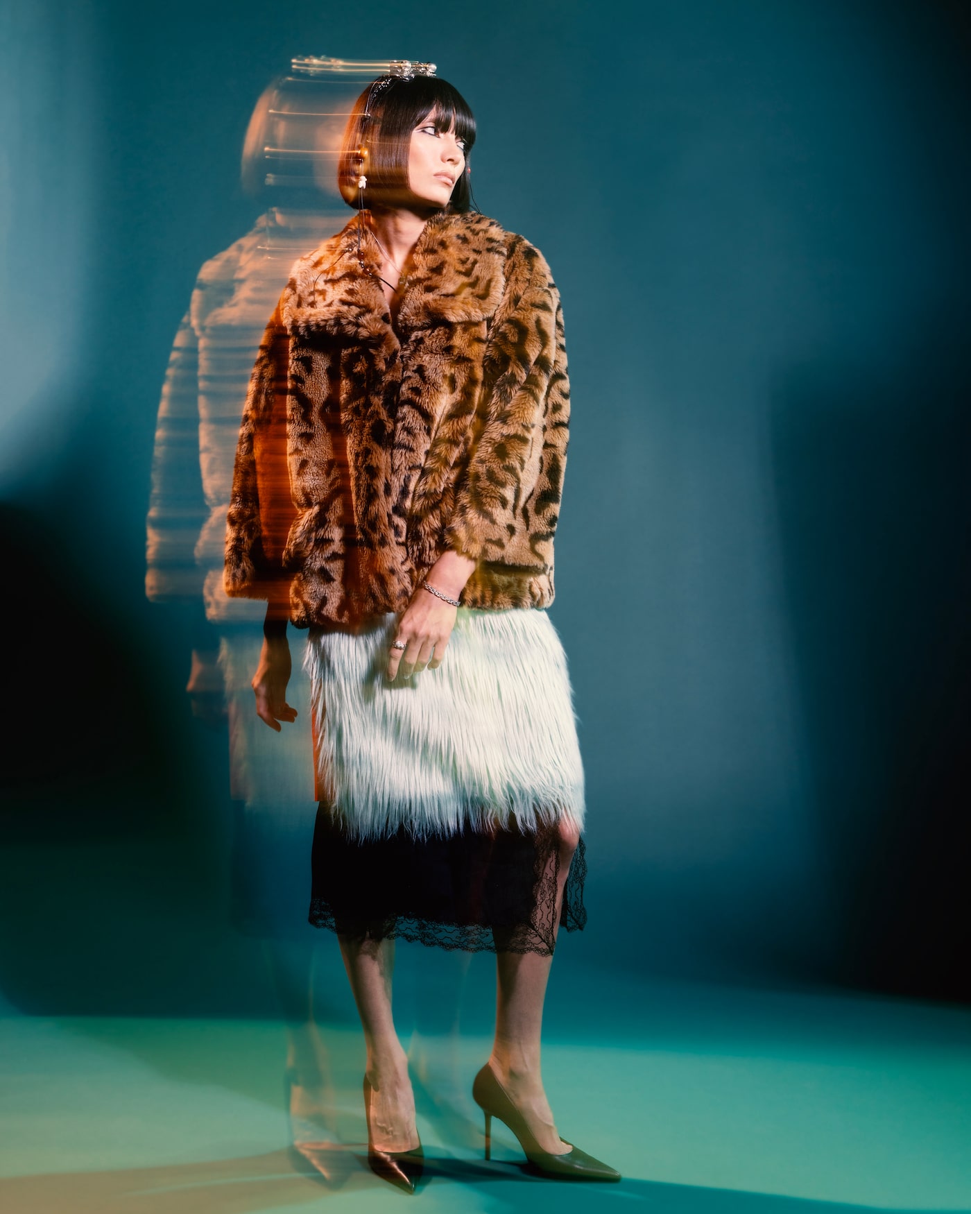 Vintage Miu Miu coat, price on request, Chopova Lowena headpiece, $425 at Absolutely Fabrics (absolutelyfabrics.com). Lii skirt, $800 at Ssense (ssense.com). Shoes, price on request at Michael Kors (michaelkors.ca). Maillon Panthère bracelet in 18-karat white gold with 2.41 carats of diamonds, $53,000, Panthère de Cartier ring in 18-karat white gold with 0.75 carats of diamonds, emeralds and onyx, $30,500 at Cartier (cartier.com). Salon white gold, aquamarine and diamond pendant, $2,150 at Birks (maisonbirks.com).