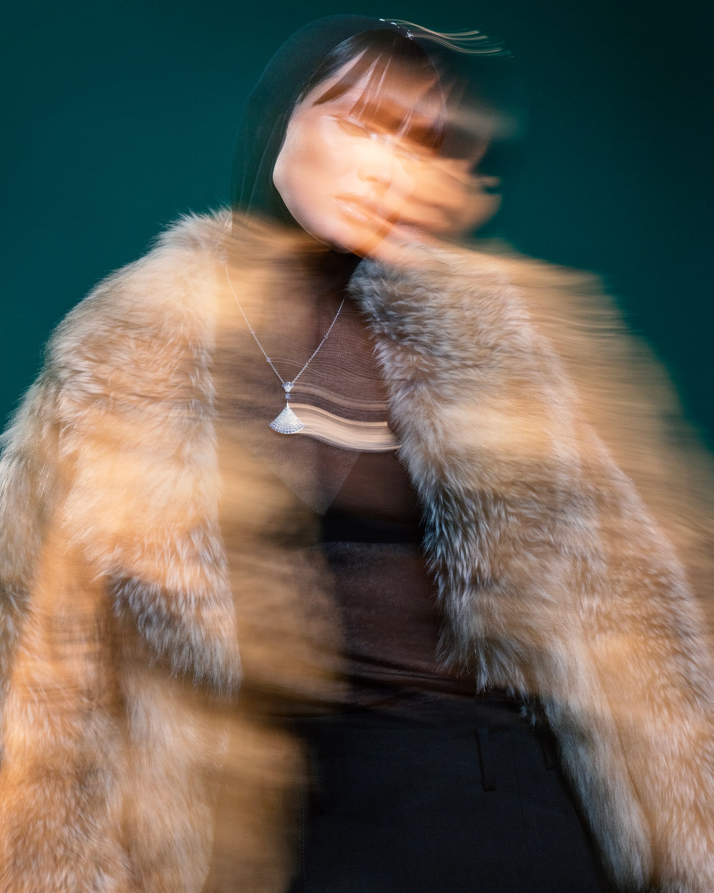 Coat, shirt, skirt, price on request at Dior (dior.com). Diva’s Dream necklace in 18-karat white gold with 4.34 carats of sapphires and 1.01 carats of diamonds, $69,000 at Bulgari (bulgari.com).