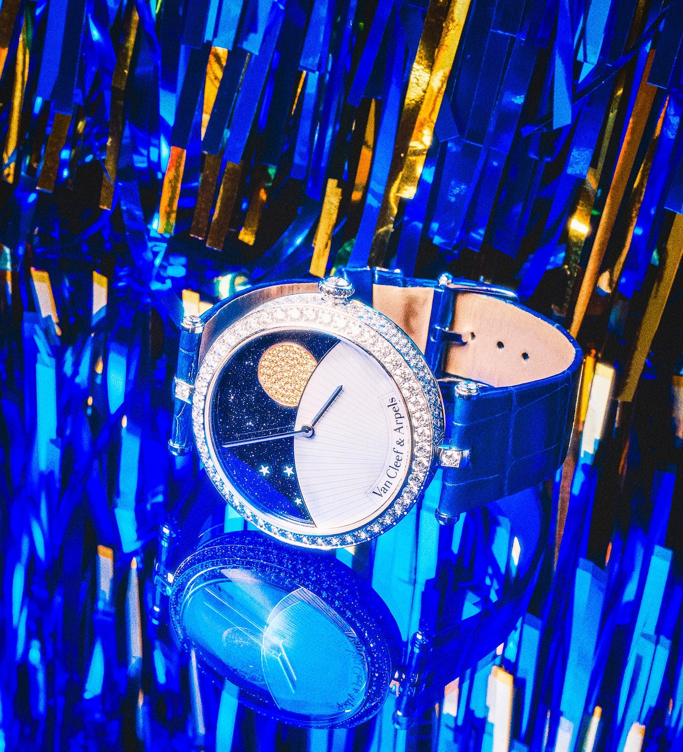 TIME TRAVEL: A celestial homage to the art of timepieces, Van Cleef & Arpels’ watch composed of 18-karat white gold, aventurine, diamond, mother-of-pearl and sapphire is a captivating feat of craft. As the seconds tick on, the sun and moon rise and set in fluid, mechanized animation. Lady Arpels Jour Nuit watch, $159,000 at Van Cleef & Arpels vancleefarpels.com
