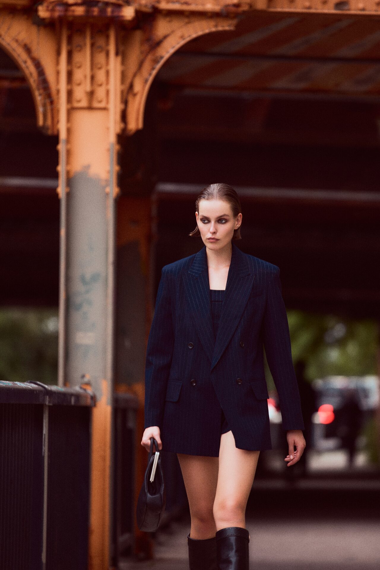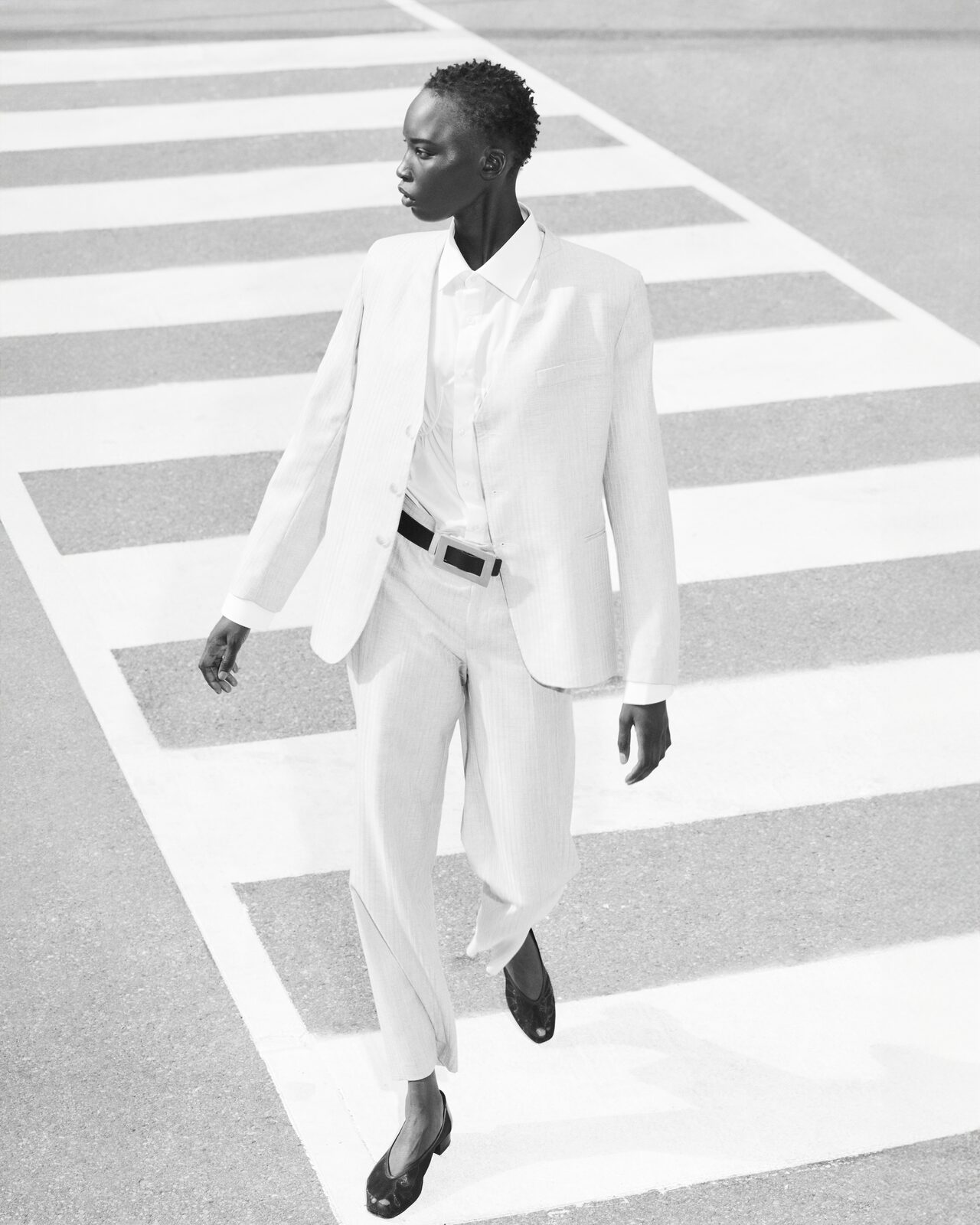 Blazer, jumper, bag, price on request at Max Mara (maxmara.com). Boots, price on request at Fendi (fendi.com).SHADOW PLAY: The discrete pattern on Bettter’s suit doesn’t pull focus from its unexpected details: a lapel-free collar and barely-attached sleeves.