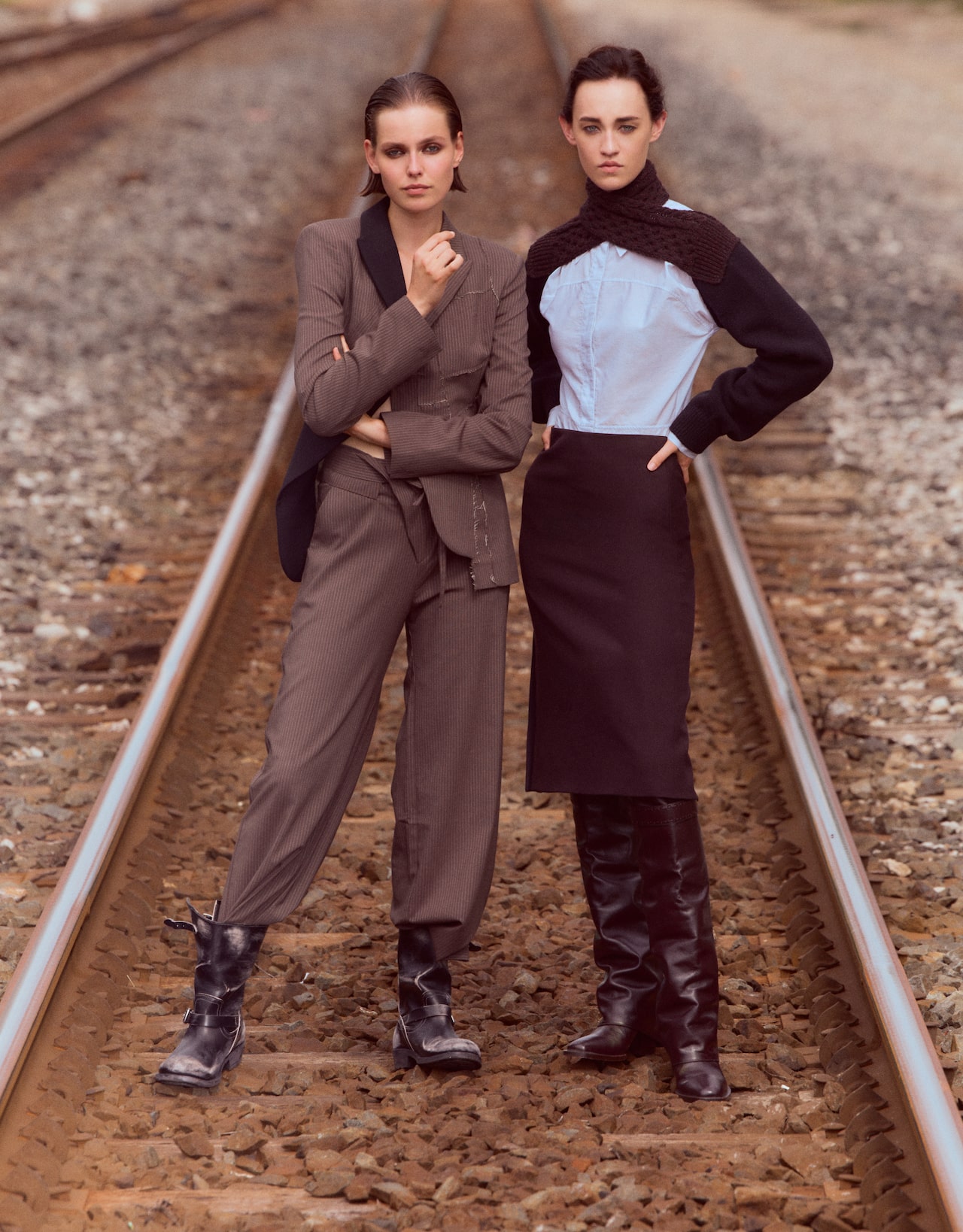 On Lula (left): Ottolinger blazer, trousers, price on request at Ssense (ssense.com). Boots, $360 at Coach (coach.com). On Elizabeth: Sweater, shirt, skirt, boots, price on request at Fendi (fendi.com).