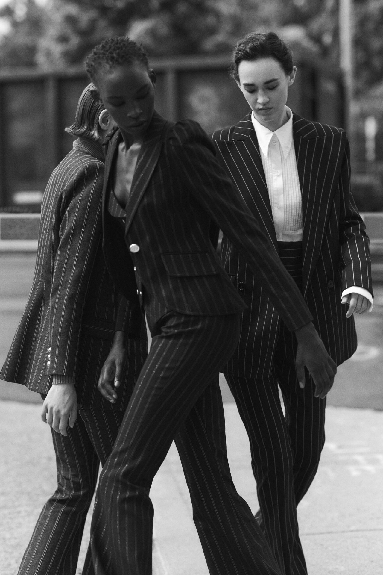 On Lula (left): Blazer, $825, trousers, $495 at Smythe (shopsmythe.ca). Herskind turtleneck, $225 through herskindofficial.ca. On Balat (middle): Blazer, $795, vest, $425, trousers, $450 at Smythe. On Elizabeth (right): Nina Ricci suit, shirt, price on request through ninaricci.com.TRACK STARS: Both Ottolinger and Fendi style their pinstripe pieces in a sculptural fashion with knit elements and frayed details disrupting the fabric’s classic origins.