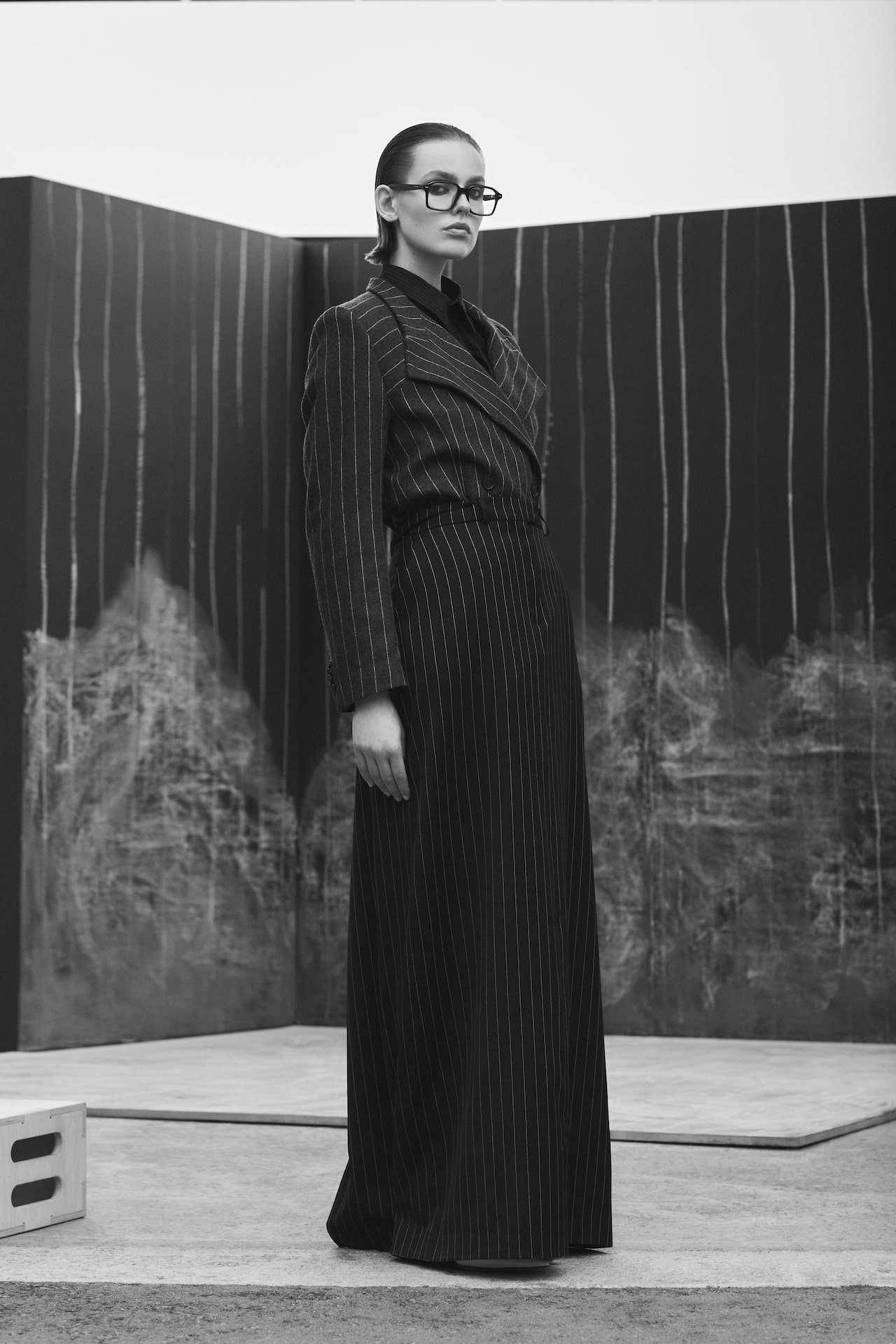 THREE'S COMPANY: There’s nothing traditionally corporate about pinstriped wool cut into a strapless dress, oversized pants or a jacket with linebacker shoulder pads.