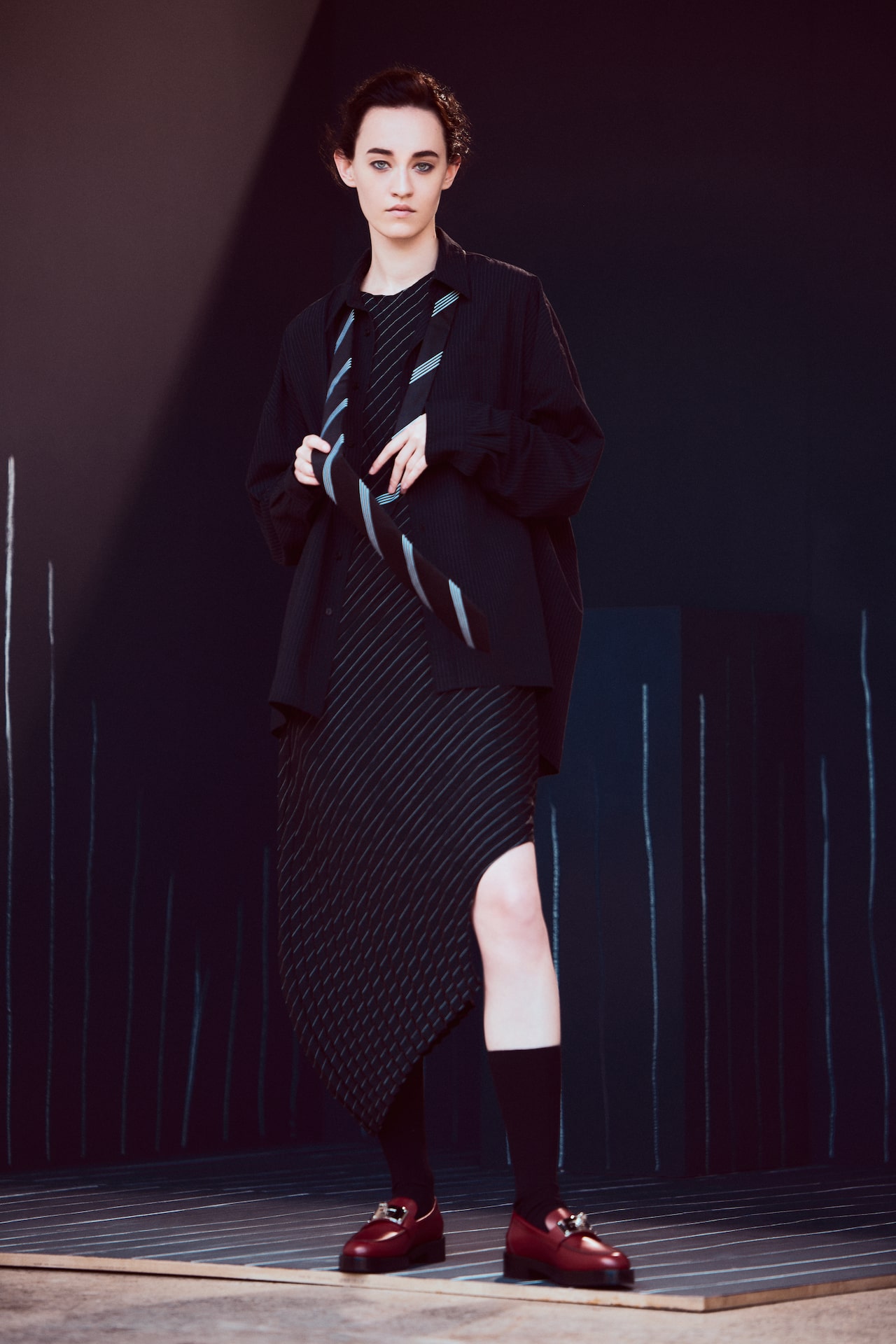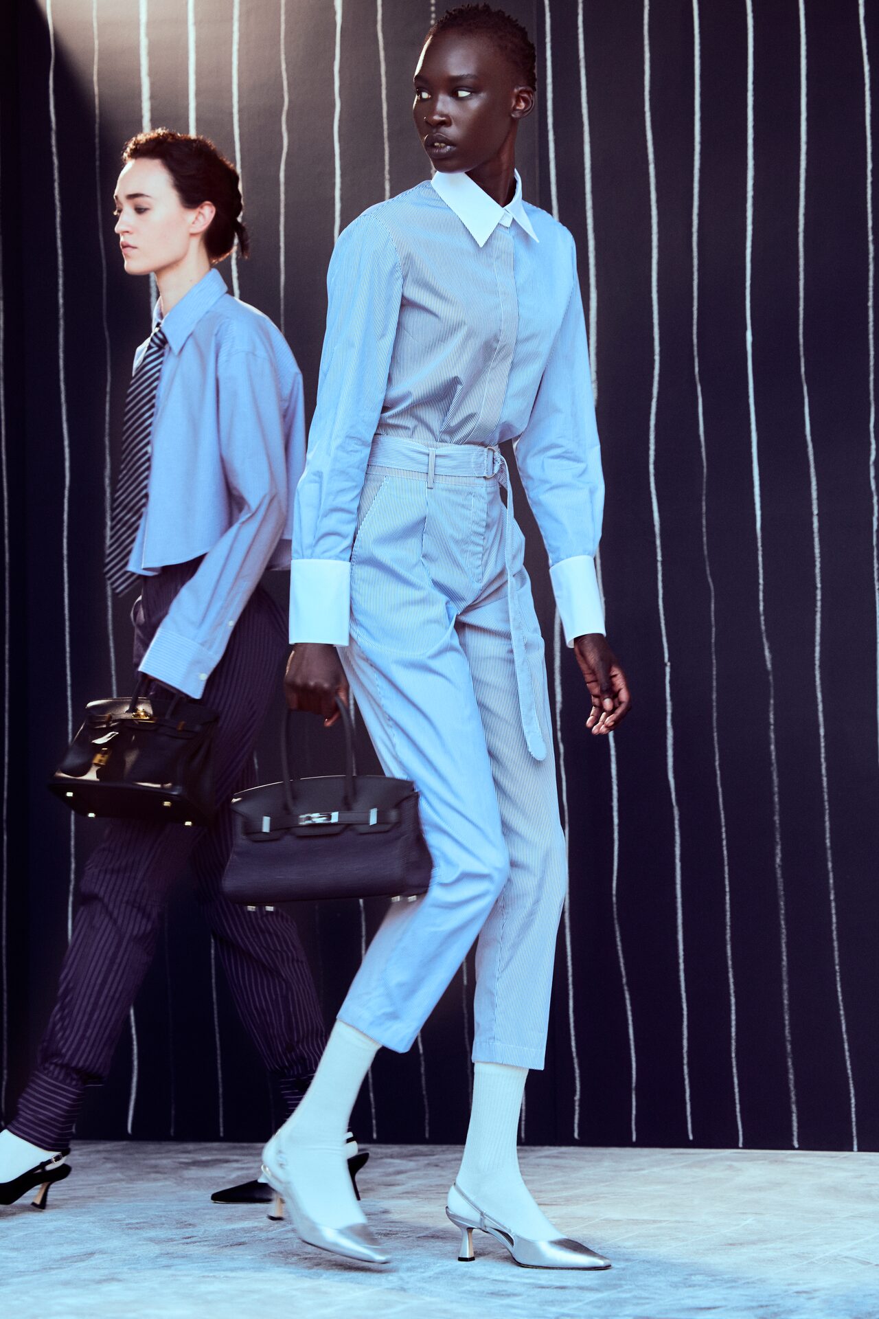 On Elizabeth (left): Acne Studios shirt, $630, Zegna tie, $270 at Ssense (ssense.com). Vintage JW Anderson trousers, $225 at Mine and Yours (mineandyours.com). Bag, $11,500 at Hermès (hermes.com). Shoes, $230 at Maguire (maguireshoes.com). On Balat: Akris shirt, $775, trousers, $775 at Holt Renfrew (holtrenfrew.com). Bag, $17,600 at Hermès. Shoes, $230 at Maguire.CHALK IT UP: Martine Rose’s skirt fools the eye via trouser details including belt loops and a zip-up fly.