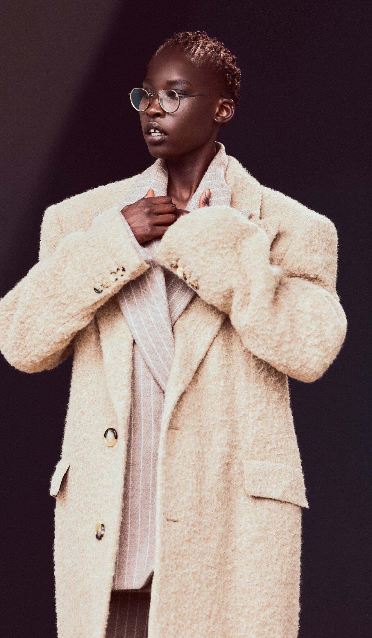 ALL THE FEELS: The plush texture of a camel-coloured coat layered over an oatmeal pantsuit suit is a lighter take on a mannish mix.