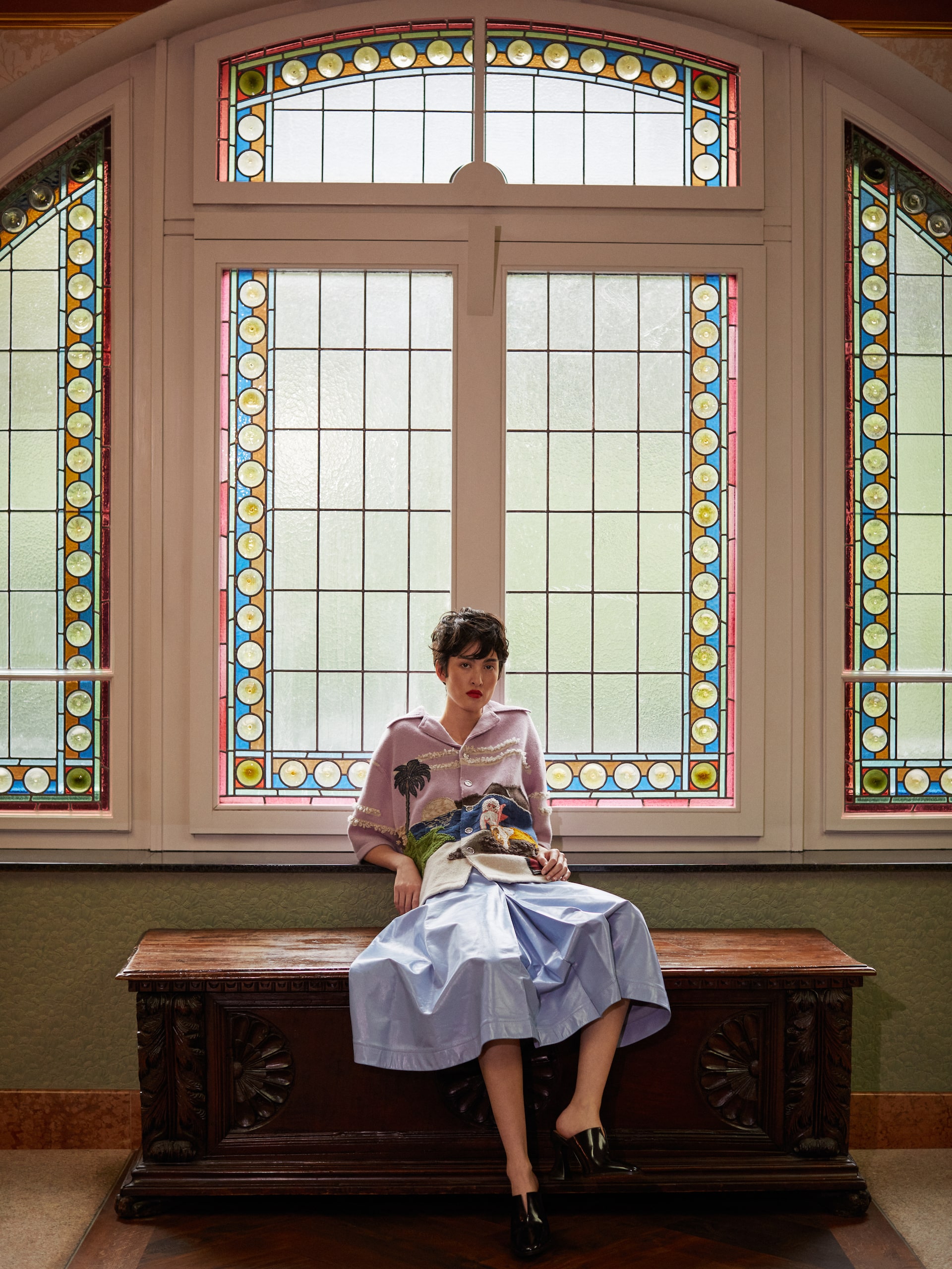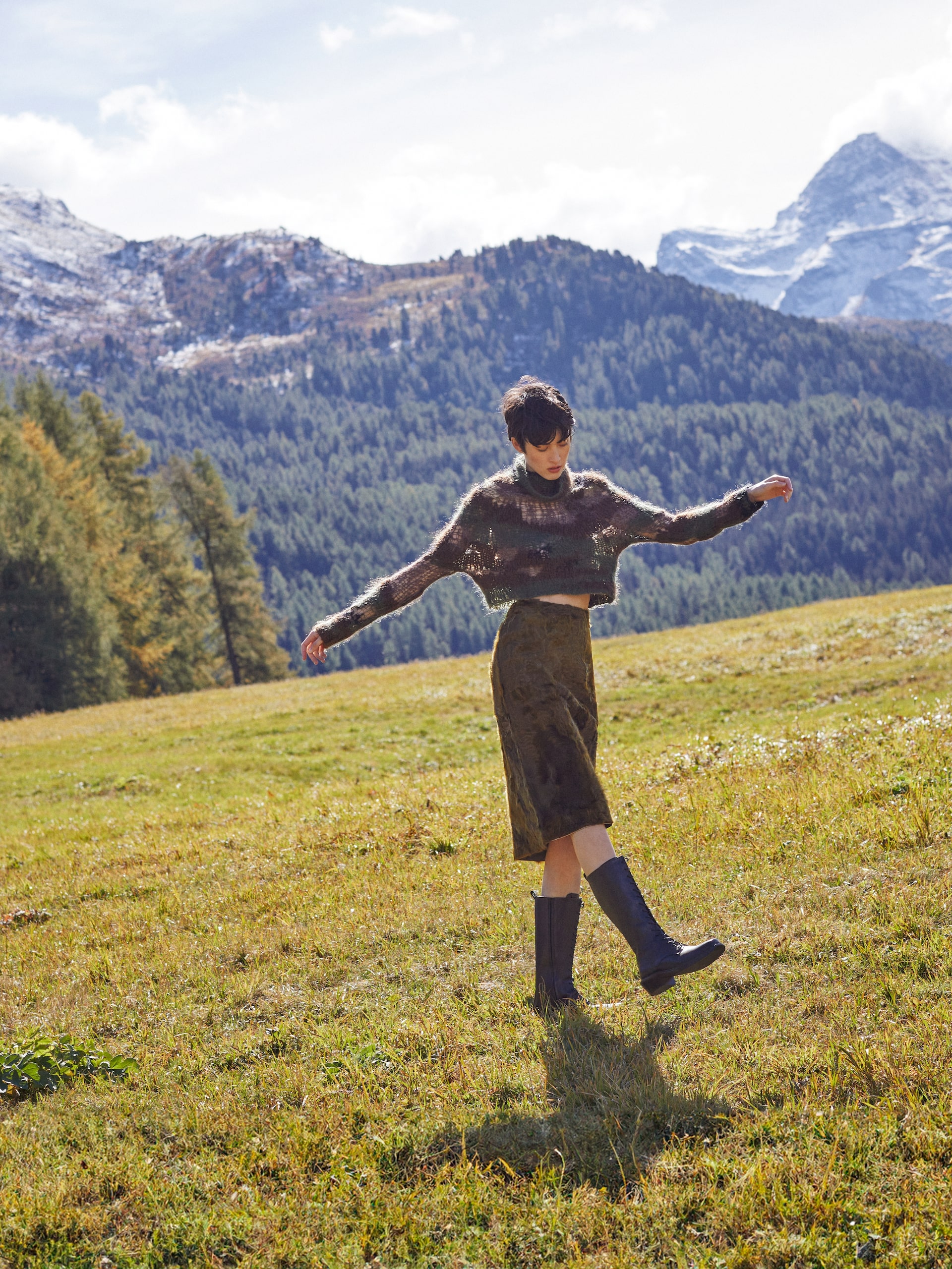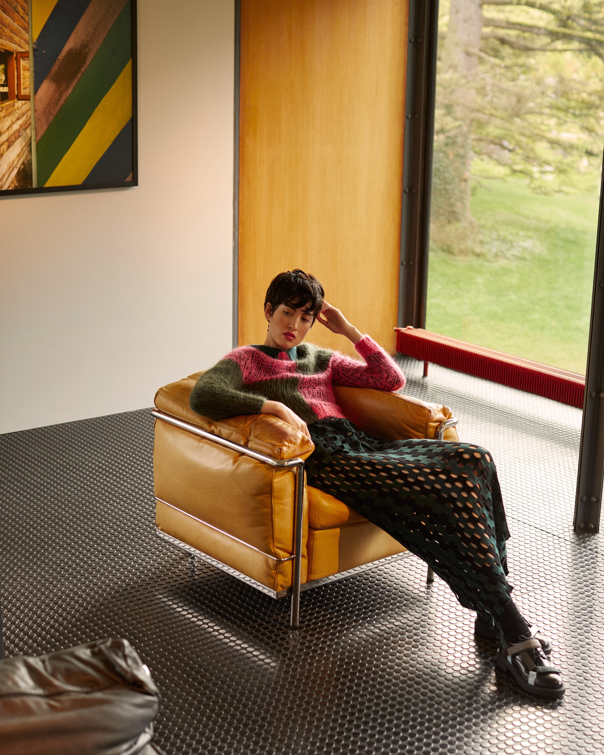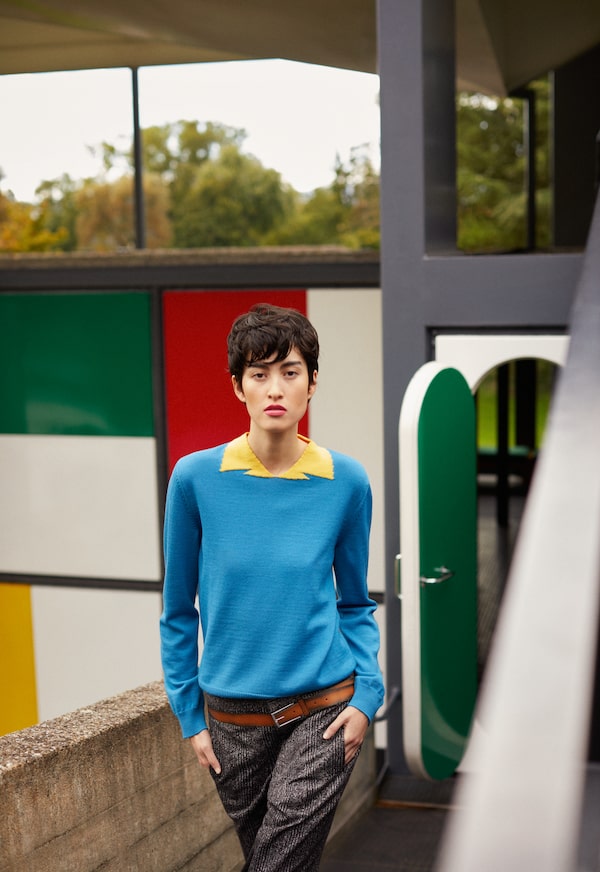 Sweater, trousers, both price on request at prada (prada.com). Photographed outside the Pavillon Le Corbusier in Zurich.