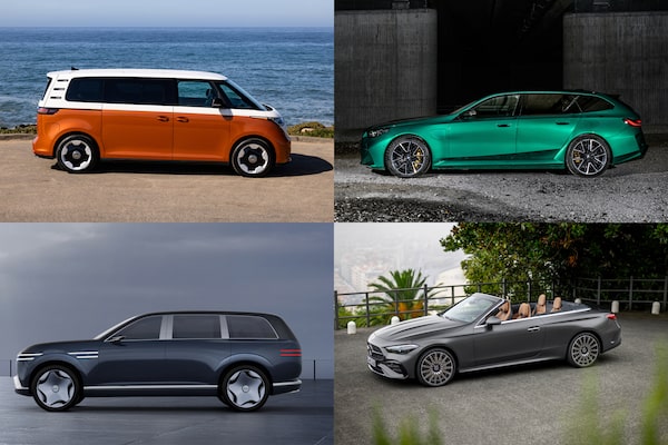Clockwise: Volkswagen ID.Buzz, BMW’s M5 wagon, Mercedes-Benz’s CLE cabriolet and the Neolun concept from Genesis.Supplied