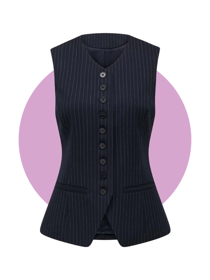 Tailored vests are trending in stores thanks to the early-2000s fashion resurgence. This fitted pinstripe one can be worn solo, with matching trousers or under a blazer in a thicker fabric. It’s made in part with recycled polyester, and is fully lined so you don’t need to wear anything under. Ever New Renee vest, buy at evernew.ca.
