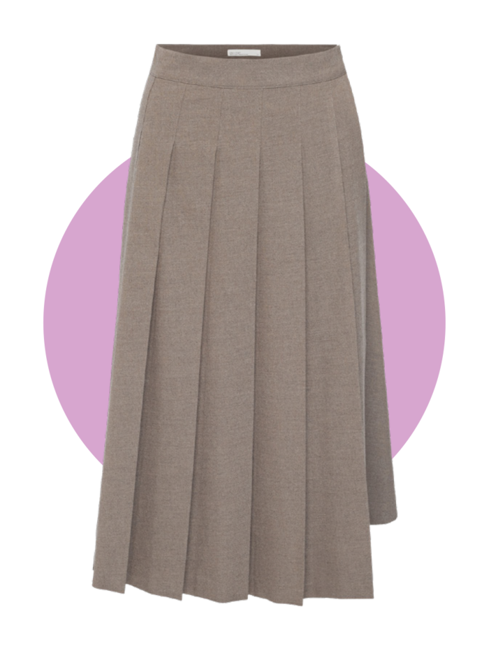 This pleated midi skirt made with a suiting fabric would look great now with your favourite knee-high boots and an oversized knit or blazer. Come spring, you can style it with flat leather sandals and a shell top. Oak + Fort midi pleated asymmetrical skirt, buy at oakandfort.com.