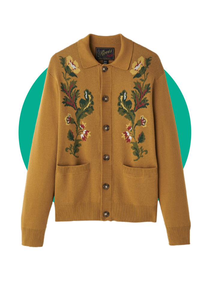Fall florals are a great way to liven up your work wardrobe. This organic cotton and recycled acrylic-blend cardigan features a pretty jacquard pattern that’s sure to be eye-catching. To keep this knit in top shape, you’ll want to turn it inside out to wash or iron, and launder it on a cold, gentle cycle only. Roots floral collar cardigan, buy at roots.com.