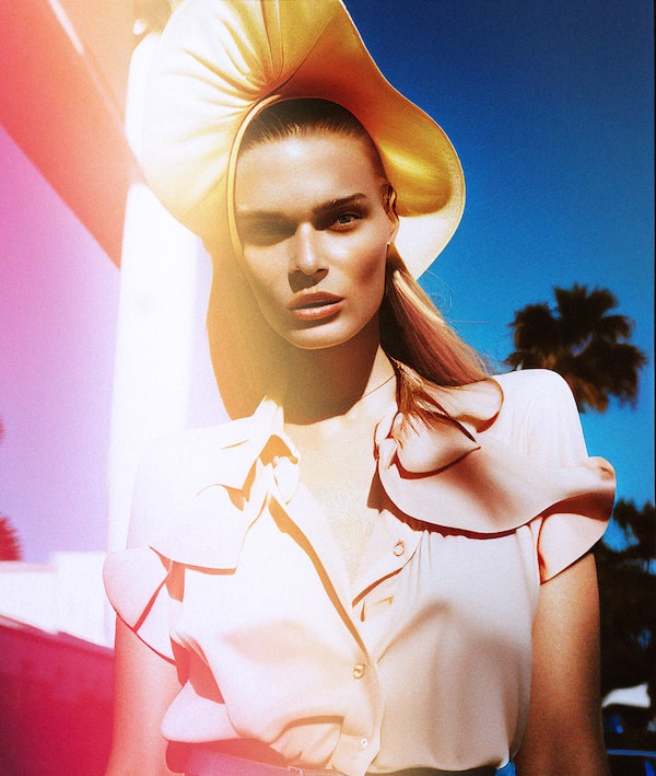 In one shot, the model – a Scarlett Johansson doppelganger – had a red crustacean sitting on her head. In another, lobster claws protruded from a white skull cap decorated with Chantilly lace, delicate white flowers and feathers. The images were highly stylized, surreal and thought-provoking.