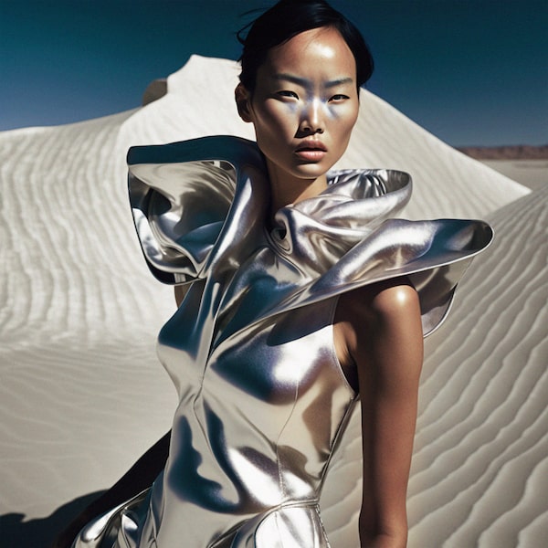 This AI photo illustration’s prompts included ‘White Sands New Mexico’ and ‘fashion photograph depicting fashion designs by Paco Rabanne,' who was known for incorporating metals and futuristic elements in his work.Photo illustration by Chris Nicholls using Midjourney