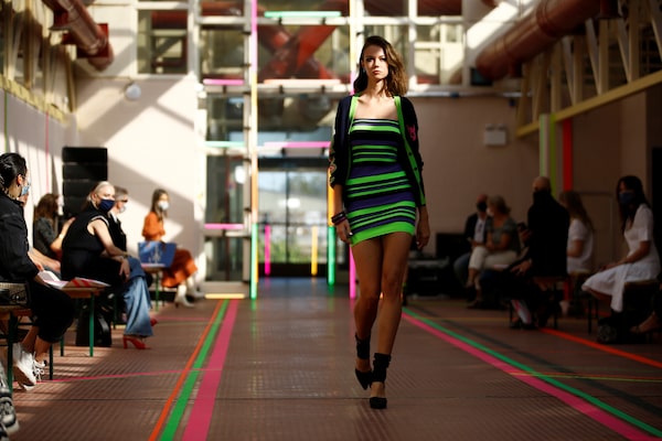 A model presents a creation during the Mark Fast catwalk show at London Fashion Week 2020, in London, Britain, on Sept. 18, 2020.HENRY NICHOLLS/Reuters