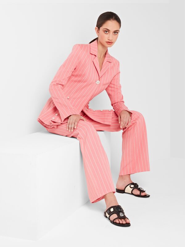 Maggie Marilyn striped blazer, $1,125, striped cotton pants, $535, at Hudson’s Bay.