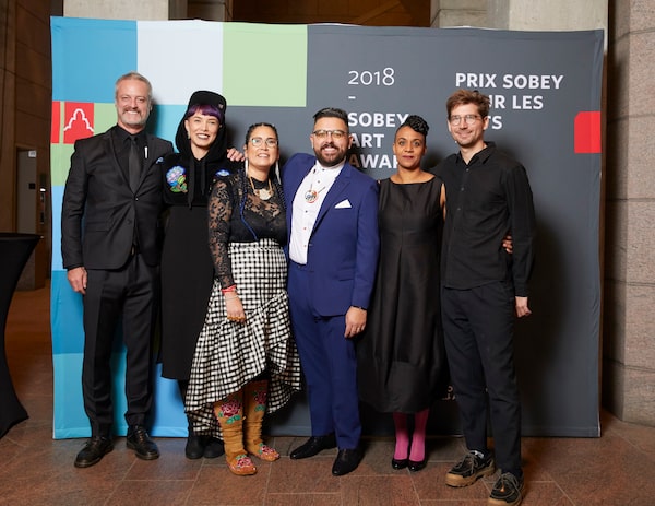 Rob Sobey with 2018 SAA finalists Jeneen Frei Njootli, Joi T. Arcand, Jordan Bennett, Kapwani Kiwanga and Jon Rafman.