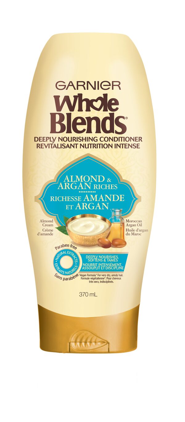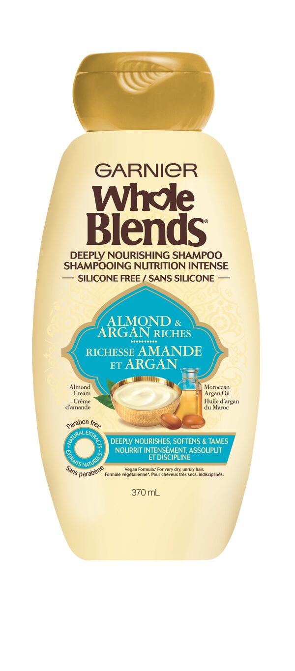 Garnier Whole Blends Almond and Argan Riches Deeply Nourishing Shampoo and Conditioner, from $5.99 each at drugstores and mass market retailers (garnier.ca).