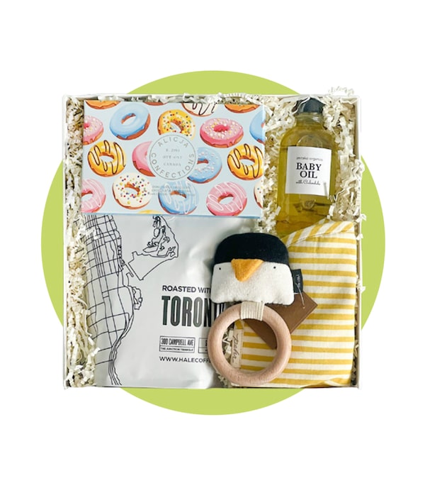 This thoughtful gift box for the whole family comes with an artisanal bar of chocolate, locally-roasted coffee beans, organic baby oil and more – all sourced from independent Canadian companies.