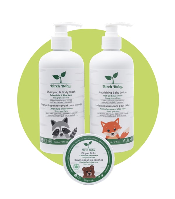 Canadian company Birch Babe’s skincare bundle is hypoallergenic and formulated for sensitive skin. It includes a shampoo and body wash, a lotion made with oat oil and aloe vera, and a diaper balm for baby.