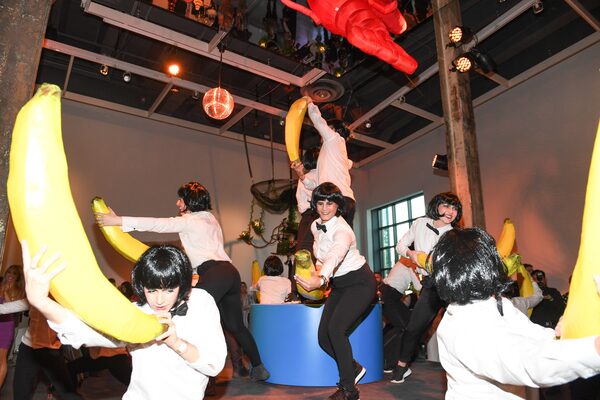 The previous week, on June 6, the Power Plant Contemporary Art Gallery hosted Power Ball. Now in its 21st year, the Toronto fundraiser highlights the wonderful and sometimes slightly wacky work of contemporary creatives, while raising funds that support this country’s leading institution devoted solely to contemporary visual art. This latest edition of the bash kicked off with a preparty reception populated by the more established supporters of the gallery (retailer Holt Renfrew served as presenting sponsor of this year’s event, titled Power Ball: 21 Club), at which Toronto artist-restaurateur Sarah Keenlyside debuted her food and performance work Centerpiece (2019), a cheeky celebration of the choreography of restaurant service with a dozen bow-tied waiters in glossy bowl-cut wigs, who danced wielding larger-than-life bananas. Later, as night fell over Toronto’s Harbourfront Centre, supporters filled in the gallery for a night of immersive artist projects and performances, including a handful curated by Tobaron Waxman of the Intergenerational LGBT Artist Residency, Dainty Smith and Imogen Quest of Les Femmes Fatales Burlesque, drag queen Tynomi Banks as well as a site-specific installation by two-spirit Métis artist Michel Dumont, an alum of the Residency, were among them.