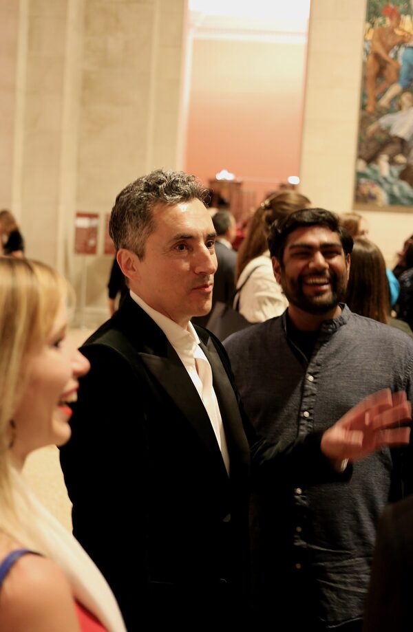 Cree artist Kent Monkman, centre, and Devan Patel, right, at New York’s Metropolitan Museum of Art event for Monkman's monumental paintings.Nolan Bryant/The Globe and Mail