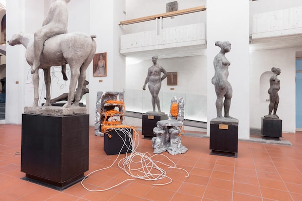 OrtaMiklos, a French and Danish duo represented by Functional, is inspired by the idea of modern ruins. They work to highlight hidden construction elements such as concrete, isolation foam and electric cables in pieces that could easily furnish Bedrock City. “We question their function by experimenting with their characteristics to explore new ways of seeing these materials in our daily lives,” the duo says.