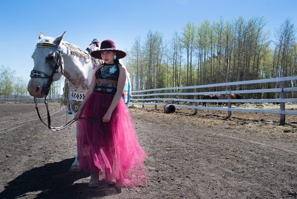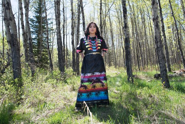 Livia Manywounds, an Indigenous designer, artist, crafter and horsewoman, creates one-of-a-kind formal wear from her family ranch on the Tsuut’ina Nation in Treaty 7. She learned to sew in junior high school and was accepted to fashion school in New York, but was unable to attend because of funding.