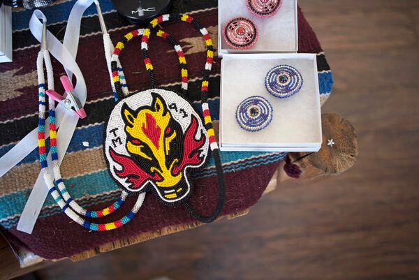 Some of the beadwork by Ashley Wright, including a Calgary Flames Blasty medallion, is displayed at Livia Manywounds’s home on the Tsuut’ina Nation in Treaty 7.Sarah B Groot/The Globe and Mail