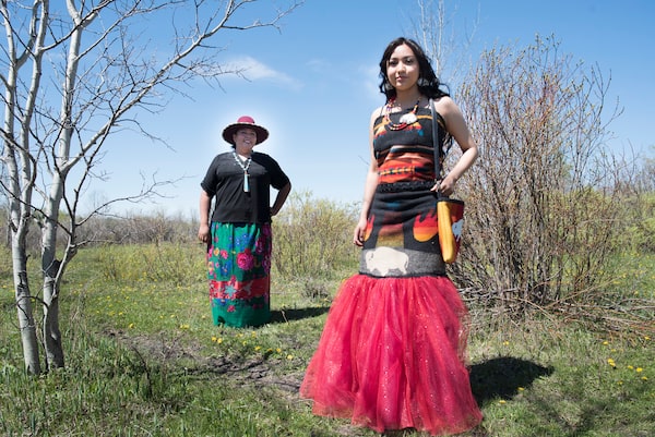 At her family ranch on the Tsuut’ina Nation in Treaty 7, Indigenous artist Livia Manywounds, 34, stands behind high school graduate Autumn Jules, 18. Manywounds created the dress Jules is wearing from a Pendleton blanket given to her by her parents to commemorate her graduation. Pendleton blankets are often given to mark achievements and special occasions. While the blanket has Indigenous designs, it’s not an Indigenous-owned company. Repurposing the blanket “is kind of a symbol of reclaiming our identity as Indigenous people and the resilience that we carry forth,” Manywounds says.Sarah B Groot/The Globe and Mail