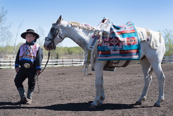 Shayne Manywounds, 8, wears a shirt and felt hat designed and made by his aunt Livia Manywounds, as well as necklaces by Ashley Wright, who founded her business, Ninaamskaakii Jewels, in May. White, the horse, wears regalia made by Manywounds that has been featured in the Calgary Stampede parade.Sarah B Groot/The Globe and Mail