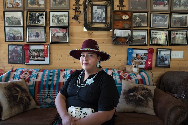 Manywounds at her family ranch home. She beaded the felt hat, and wears a necklace and earring set by Ashley Wright. Behind her are family photographs, including images of her father, who won the Calgary Stampede steer-decorating competition in 1953, and her grandmother, Annie Manywounds, who was a teepee owner in the Stampede. Manywounds was crowned the Indian Princess, now First Nations princess, at the 2007 Calgary Stampede.Sarah B Groot/The Globe and Mail