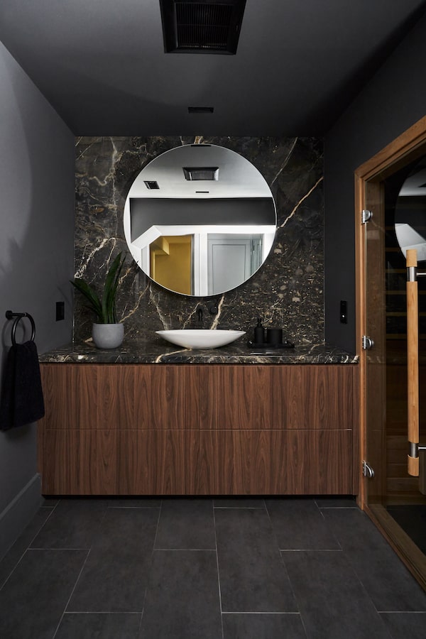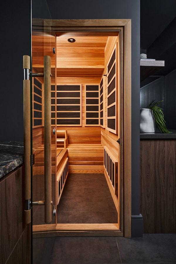 Inspired by the moody palette at the Shangri-La hotel in Toronto, Black covered the space in dark marble and tile. Showstopper items include a custom infrared sauna by SaunaFin, a steam shower, a lounge area and a bar with a mini fridge. The client will host up to four friends there to watch a game, making the space both social and restorative.