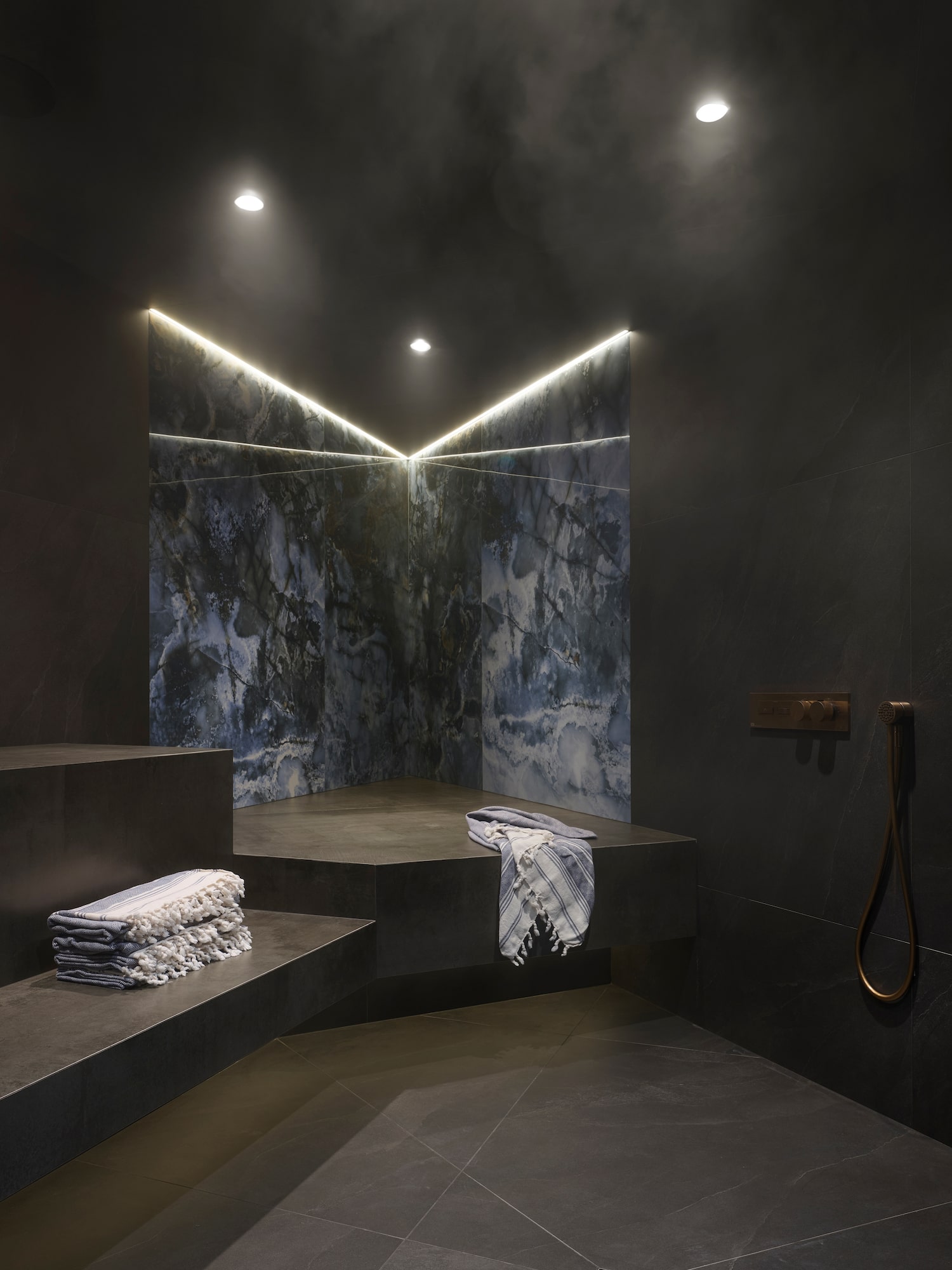 The spa is covered in dark marble and tile.Jules Lee/Supplied
