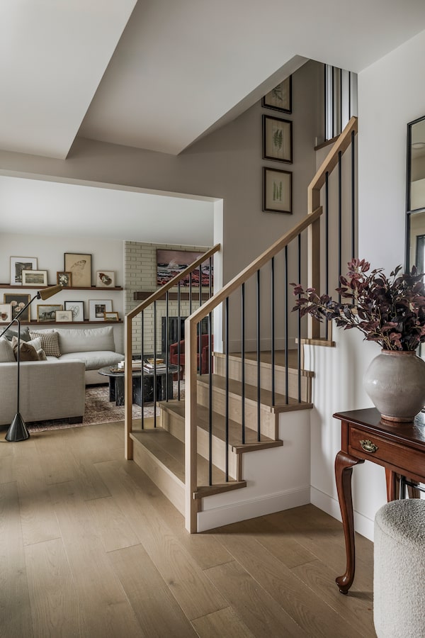 Among the things she kept were a grandfather clock built by her grandfather, a desk and some chairs. Alex also reused a front hall console. The piece, with curved legs, is more traditional than some of the newer, more streamlined furniture in the nearby living room. But Alex appreciates it nonetheless. “It’s beautiful,” she says. “It’s got some character.”