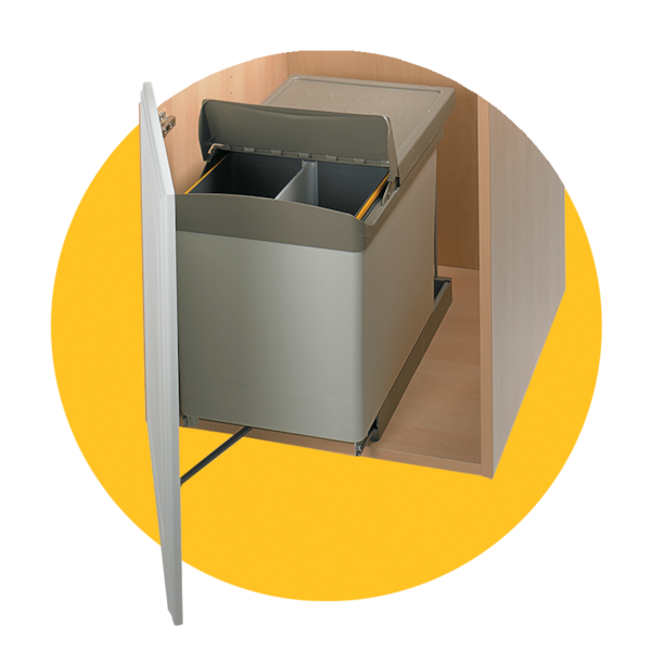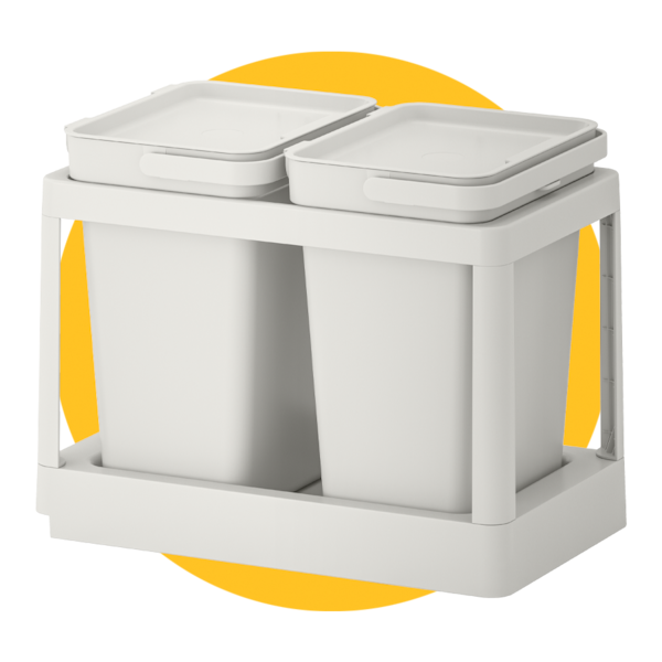 The Hallbar recycling solution includes two bins to handle different sorting requirements. One can be for paper, for example, and another for plastics and glass. Each 20-litre bin nestles into a pullout drawer and has a basket handle for easy curb-side carrying.